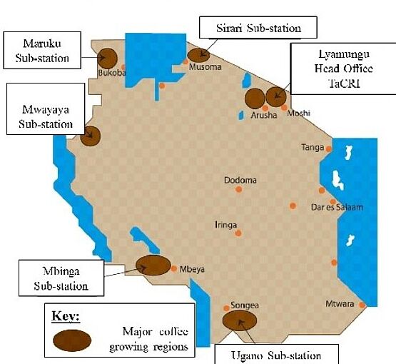 Technology transfer, training & advocacy are seen as important TaCRI activities if Tanzania is to regain and enhance its reputation for producing large enough volumes of quality coffees. With its head office at Lyamungu, Kilimanjaro Region, TaCRI will serve the whole country through substations at Mbimba in Mbozi District, Ugano in Mbinga District, Mwayaya in Buhigwe District, Maruku in Bukoba District and Sirari in Tarime District. For the past 19 years period since TaCRI inception, TaCRI technologies have been promoted in Manyara, Arusha, Kilimanjaro, Tanga, Lindi and Morogoro regions in the Northern zone; Iringa, Njombe and Ruvuma regions in the Southern zone; Rukwa, Songwe, Katavi and Mbeya regions in the Southern Highlands zone; Kigoma and Kagera in the Western zone; Geita and Mwanza in the Lake zone and Mara region.